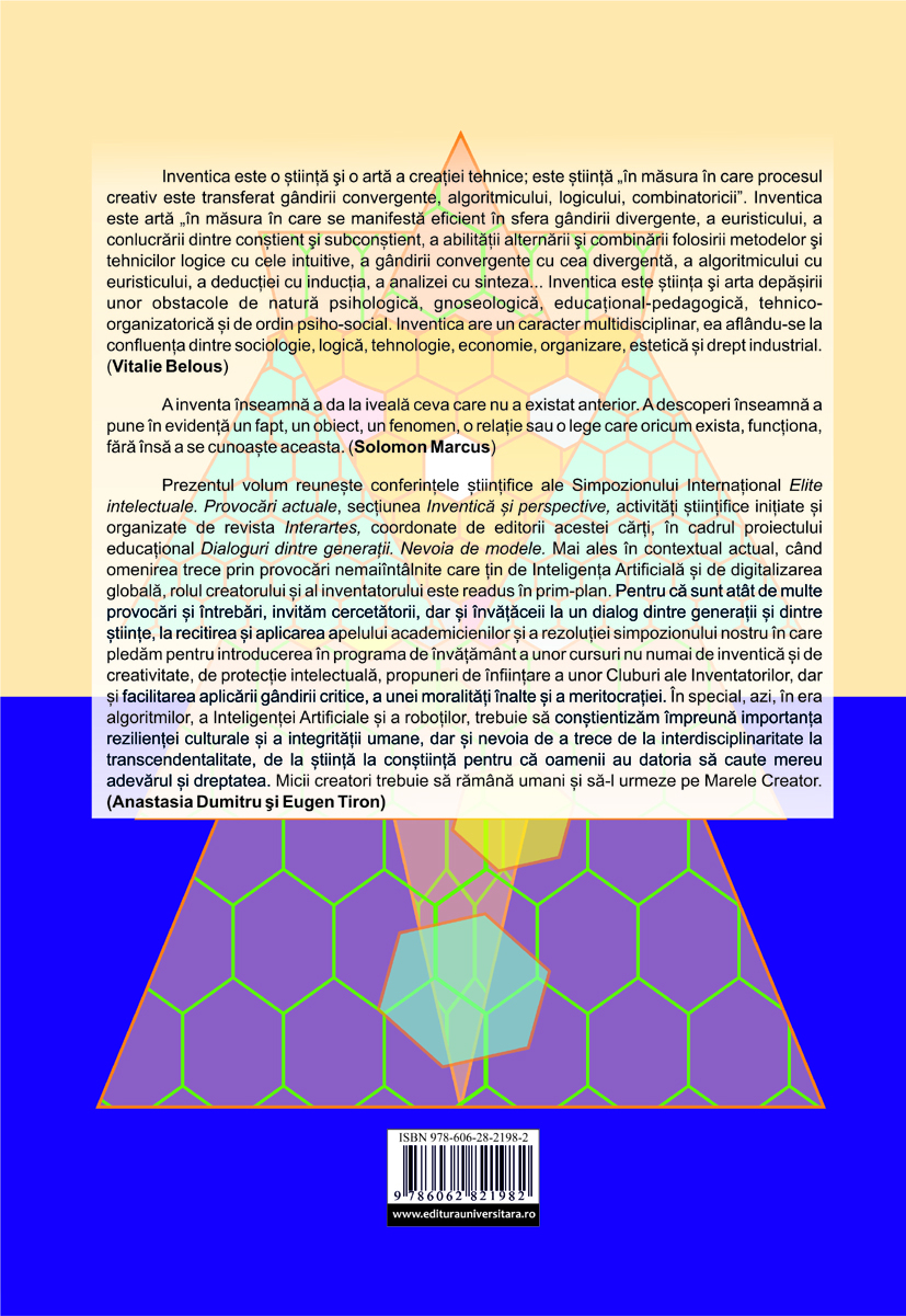 Prezentul volum reunește conferințele științifice ale Simpozionului Internațional Elite intelectuale. Provocări actuale, secțiunea Inventică și perspective, activități științifice inițiate și organizate de revista Interartes, coordonate de editorii acestei cărți, în cadrul proiectului educațional Dialoguri dintre generații. Nevoia de modele. Prima etapă a avut loc în perioada 9‑14 noiembrie 2025, în timpul Săptămânii Cercetare și Expertiză în Liceele și Universităţile Dobrogene, sub egida Academiei Navale ,,Mircea cel Bătrân”, a Universității ,,Ovidius” din Constanța și ,,AGIR” din Constanța. Debutul a avut loc la Biblioteca Județeană ,,Ioan N. Roman” Constanța, în data de 11 noiembrie 2025, când s‑au susținut lucrări științifice și s‑au vizionat expoziții cu: brevete de invenție, certificate de inovator, modele industriale, ,,Tehnoredactarea, tehnică și artă” și expoziție de fotohaiku ,,Orizont marin, 2025”, precum și filmul Construcțiile navale în România.