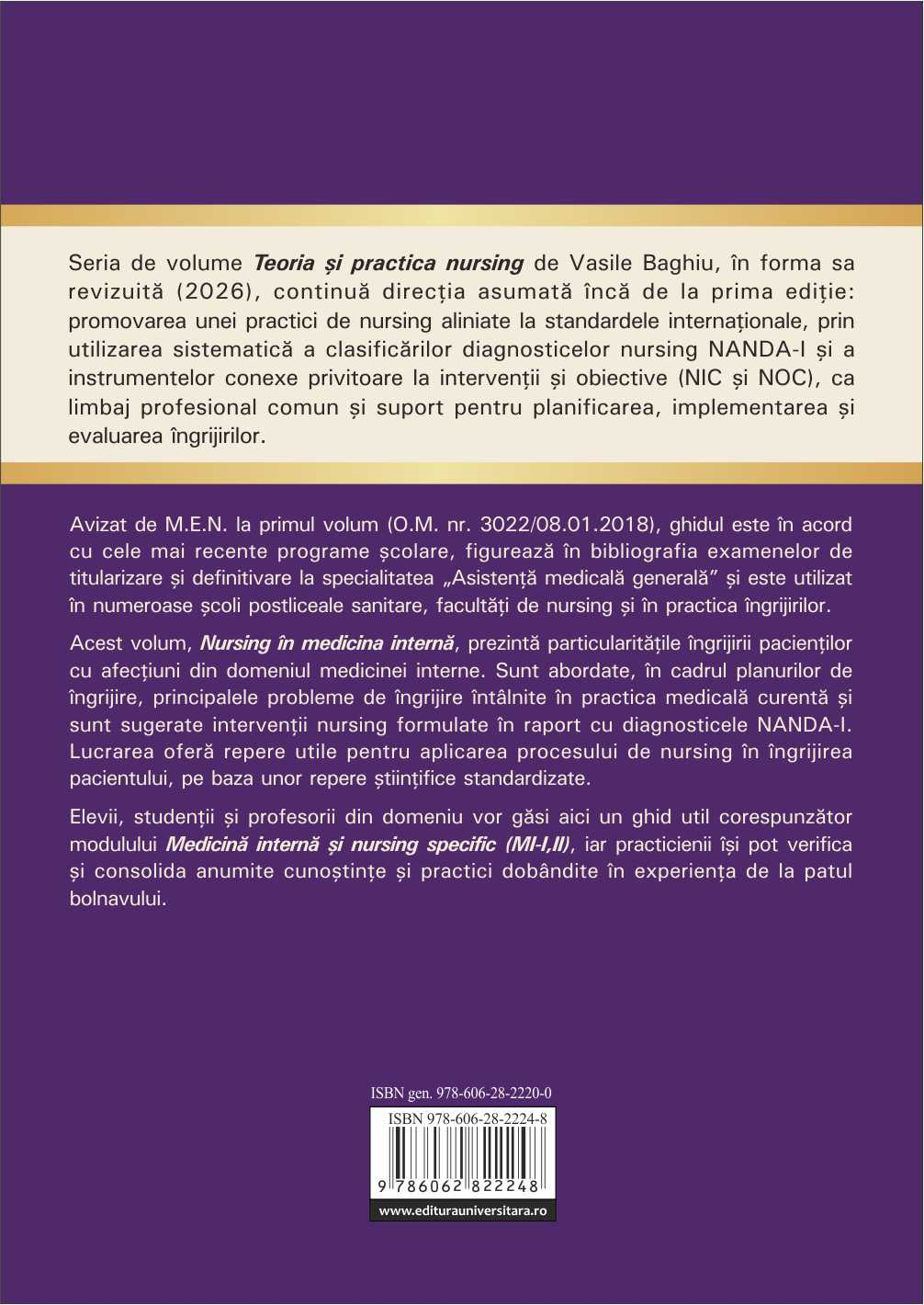 Seria de volume Teoria și practica nursing de Vasile Baghiu, în forma sa revizuită, continuă direcția asumată încă din prima ediție: promovarea unei practici de nursing aliniate la standardele internaționale, prin utilizarea sistematică a clasificărilor diagnosticelor nursing NANDA-I și a instrumentelor conexe privitoare la intervenții și obiective (NIC și NOC), ca limbaj profesional comun și suport pentru planificarea, implementarea și evaluarea îngrijirilor.