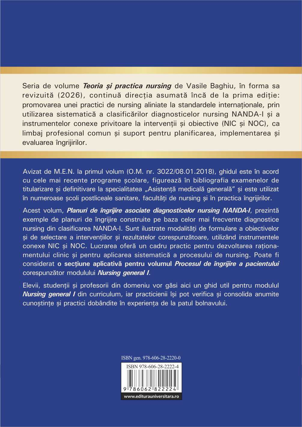 Seria de volume Teoria și practica nursing de Vasile Baghiu, în forma sa revizuită, continuă direcția asumată încă din prima ediție: promovarea unei practici de nursing aliniate la standardele internaționale, prin utilizarea sistematică a clasificărilor diagnosticelor nursing NANDA-I și a instrumentelor conexe privitoare la intervenții și obiective (NIC și NOC), ca limbaj profesional comun și suport pentru planificarea, implementarea și evaluarea îngrijirilor.