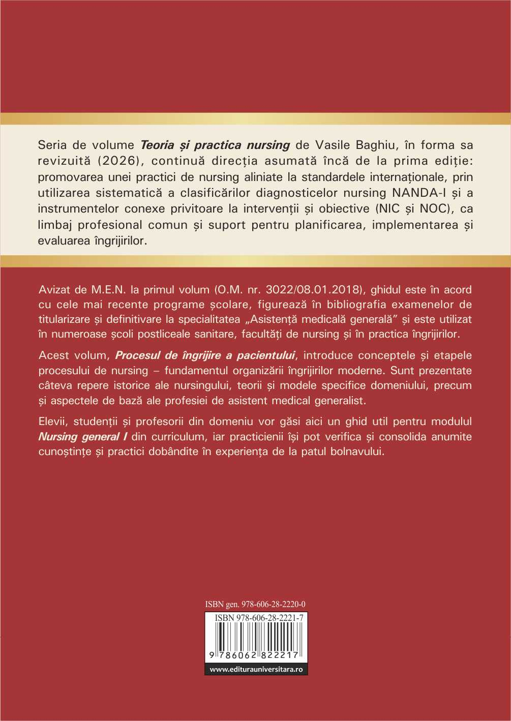 Seria de volume Teoria și practica nursing de Vasile Baghiu, în forma sa revizuită, continuă direcția asumată încă din prima ediție: promovarea unei practici de nursing aliniate la standardele internaționale, prin utilizarea sistematică a clasificărilor diagnosticelor nursing NANDA-I și a instrumentelor conexe privitoare la intervenții și obiective (NIC și NOC), ca limbaj profesional comun și suport pentru planificarea, implementarea și evaluarea îngrijirilor.