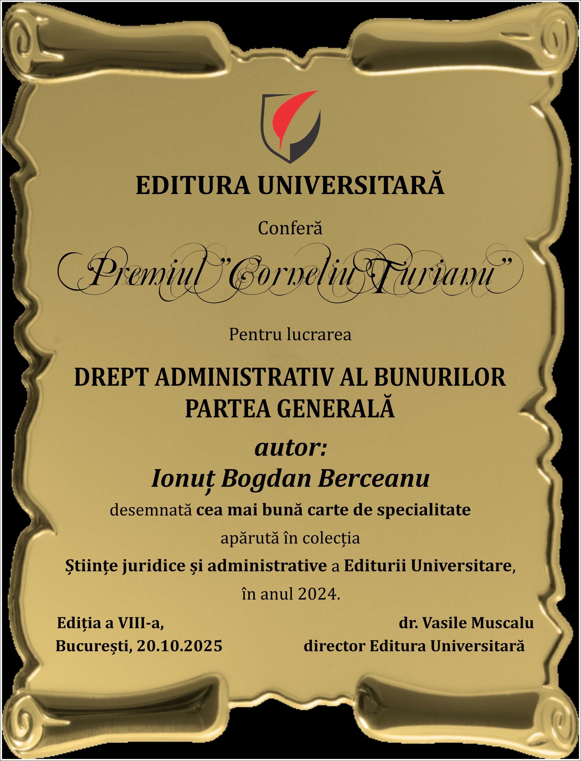 Cartea ”Drept administrativ al bunurilor. Partea generală”, autor Ionuț-Bogdan Berceanu, a fost desemnată, în urma jurizării, cea mai bună carte de specialitate apărută în anul 2024, în colecția Științe juridice și administrative a Editurii Universitare și i-a fost decernat PREMIUL ”CORNELIU TURIANU”.