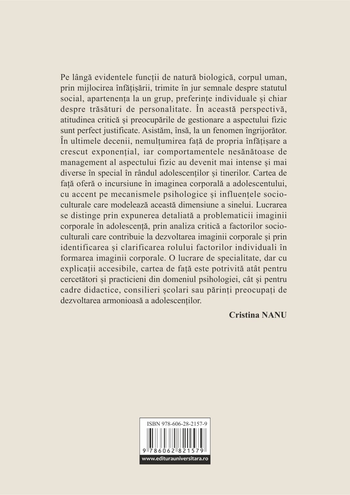 Cartea debutează cu o clarificare conceptuală a constructului de imagine corporală și a dimensiunilor utilizate în operaționalizarea constructului și investigarea problematicii imaginii corporale din perspectivă psihologică. Continuă cu o prezentare a mitului corpului perfect în contextul culturii consumatoriste și a efectelor asupra imaginii corporale. Sunt prezentate principalele modele teoretice explicative ale formării imaginii corporale, detaliind rolul trăsăturilor individuale și al factorilor socio‑culturali în dezvoltarea atitudinii față de propriul corp. În ultimul capitol sunt incluse studii privind factorii sociali și individuali asociați imaginii corporale în adolescență, studii realizate pe parcursul programului de doctorat desfășurat la Universitatea Babeș‑Bolyai din Cluj‑Napoca sub îndrumarea doamnei profesor universitar doctor Adriana Băban.