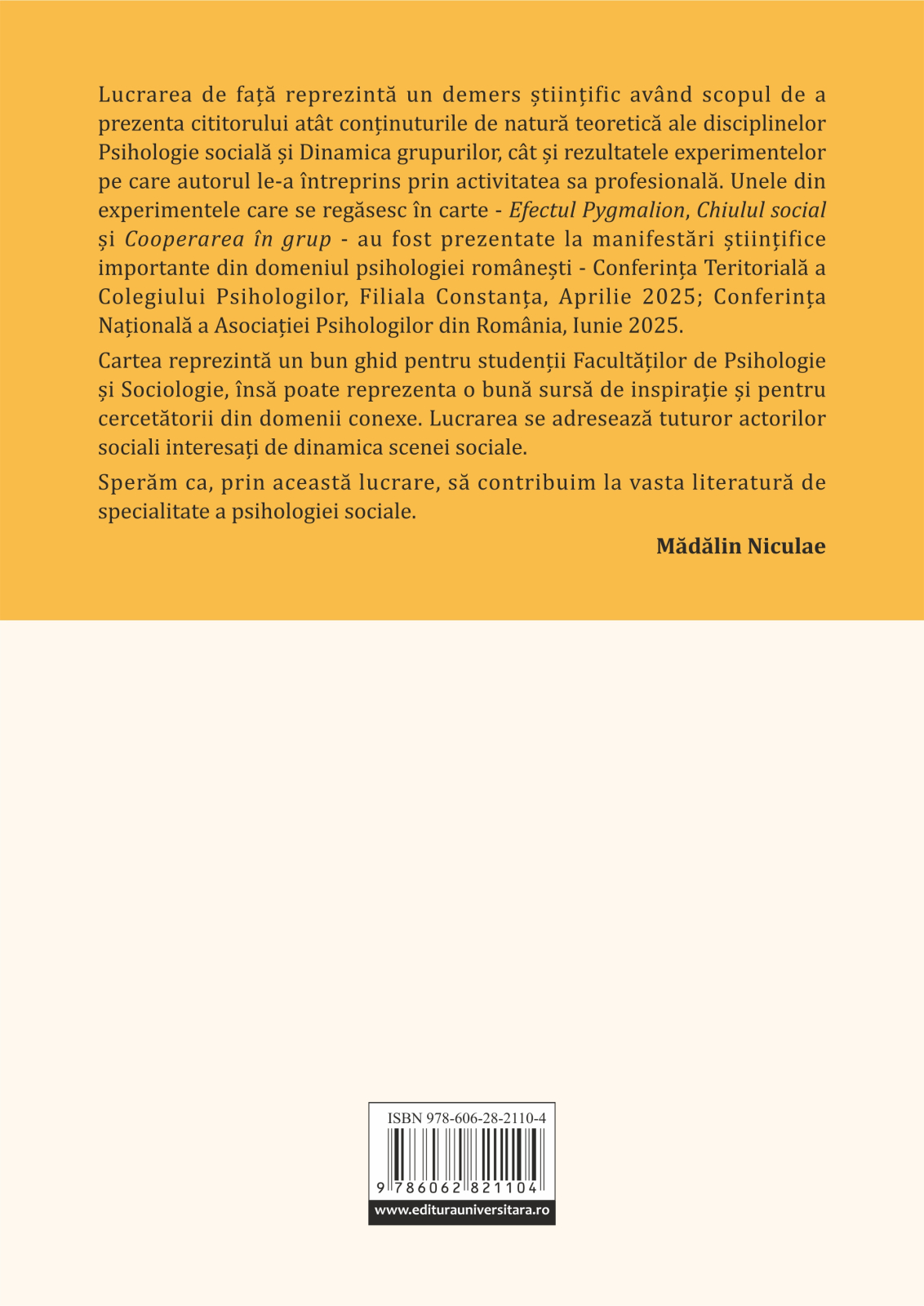 Cartea propusă de psihologul Mădălin Niculae reprezintă un scurt compendiu de psihologie socială și dinamica grupurilor. Autorul prezintă pe scurt obiectul și domeniul celor două discipline, una singură dacă luăm în considerație definițiile psihologiei sociale, atent selecționate din literatura de specialitate.