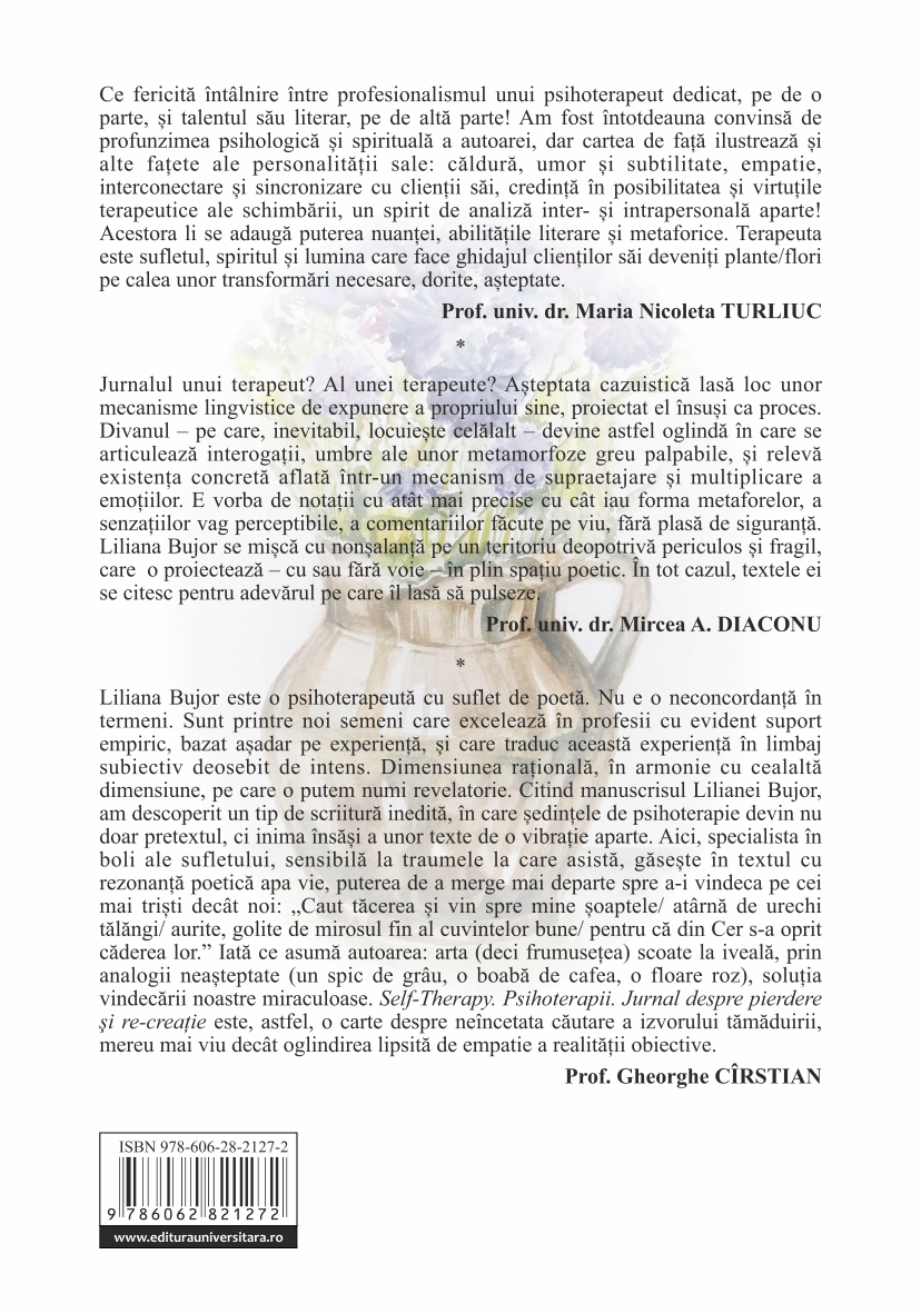 Liliana Bujor este o psihoterapeută cu suflet de poetă. Nu e o neconcordanță în termeni. Sunt printre noi semeni care excelează în profesii cu evident suport empiric, bazat așadar pe experiență, și care traduc această experiență în limbaj subiectiv deosebit de intens. Dimensiunea rațională, în armonie cu cealaltă dimensiune, pe care o putem numi revelatorie. Citind manuscrisul Lilianei Bujor, am descoperit un tip de scriitură inedită, în care ședințele de psihoterapie devin nu doar pretextul, ci inima însăși a unor texte de o vibrație aparte. Aici, specialista în boli ale sufletului, sensibilă la traumele la care asistă, găsește în textul cu rezonanță poetică apa vie, puterea de a merge mai departe spre a-i vindeca pe cei mai triști decât noi: "Caut tăcerea și vin spre mine șoaptele/ atârnă de urechi tălăngi/ aurite, golite de mirosul fin al cuvintelor bune/ pentru că din Cer s-a oprit căderea lor." Iată ce asumă autoarea: arta (deci frumusețea) scoate la iveală, prin analogii neașteptate (un spic de grâu, o boabă de cafea, o floare roz), soluția vindecării noastre miraculoase. "Self-Therapy. Psihoterapii. Jurnal despre pierdere şi re-creație" este, astfel, o carte despre neîncetata căutare a izvorului tămăduirii, mereu mai viu decât oglindirea lipsită de empatie a realității obiective.