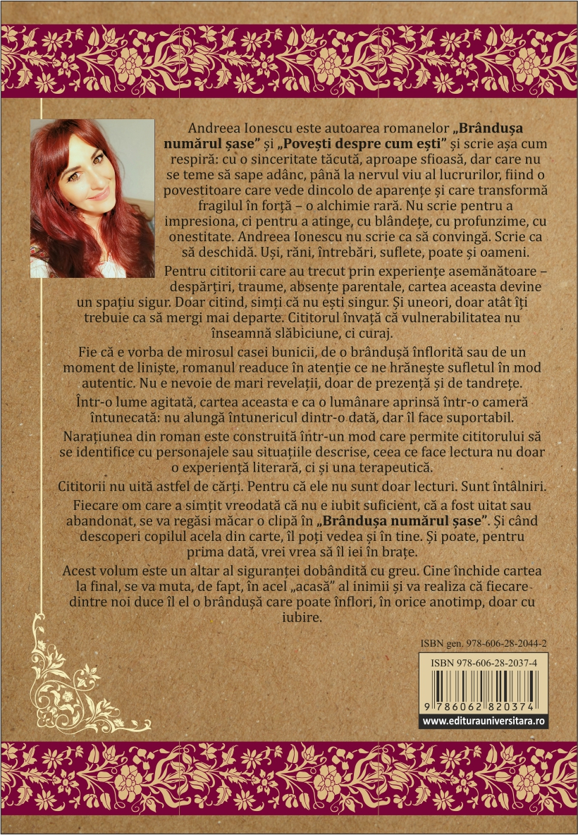 Andreea Ionescu este autoarea romanelor ”Brândușa numărul șase” și ”Povești despre cum ești” și scrie așa cum respiră: cu o sinceritate tăcută, aproape sfioasă, dar care nu se teme să sape adânc, până la nervul viu al lucrurilor, fiind o povestitoare care vede dincolo de aparențe și care transformă fragilul în forță – o alchimie rară. Nu scrie pentru a impresiona, ci pentru a atinge, cu blândețe, cu profunzime, cu onestitate. Andreea Ionescu nu scrie ca să convingă. Scrie ca să deschidă. Uși, răni, întrebări, suflete, poate și oameni.