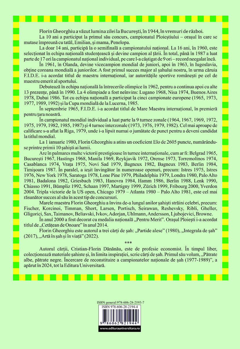 Am întâlnit numele lui Florin Gheorghiu în jurul vârstei de 14 ani, când am citit pentru prima oară o revistă de șah și am făcut rost de cartea sa „Partide alese”. Am răsfoit‑o febril, întrucât șahul mi se părea pe atunci – și încă mi se pare și astăzi – un univers mirific, dar greu de înțeles, iar partidele de șah, în special cele ale corifeilor, mi se par a fi elementele sale primordiale. După trei decenii, l‑am cunoscut personal pe marele maestru, cu ocazia festivității de retragere din șah din primăvara anului 2014. Emoționat, i‑am solicitat un autograf, pe care mi l‑a acordat cu amabilitatea sa definitorie. În anii următori, am avut prilejul și onoarea să fiu colaboratorul său la scrierea celorlalte două cărți, „Integrala de șah” și „Artă în șah și în viață”.