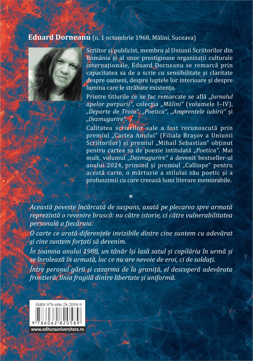 Cititorul care deschide această carte nu va găsi doar o poveste despre armată, ci un text despre frontierele vieții, despre granițele dintre oameni, despre linia fragilă care separă libertatea de constrângere și tinerețea de maturitate. Frontiera este o carte care se citește ca o confesiune și se reține ca o mărturie.